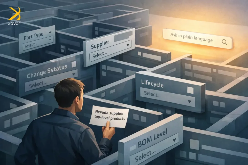 PLM systems keep information connected throughout the product development process. But most of them make it really difficult to find the information you’re looking for. You have to chase answers through rigid filters over and over again. Pick a part type, a supplier, maybe a change status, then stack some more filters to approximate your question.