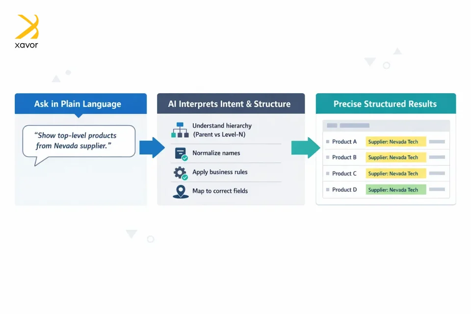 In practice, that means you simply describe what you need in plain language. An AI layer translates your intent into precise, structure-aware, search-engine-specific queries behind the scenes. It understands hierarchy, respects business rules, and normalizes messy names so minor spelling/casing differences don’t block results.