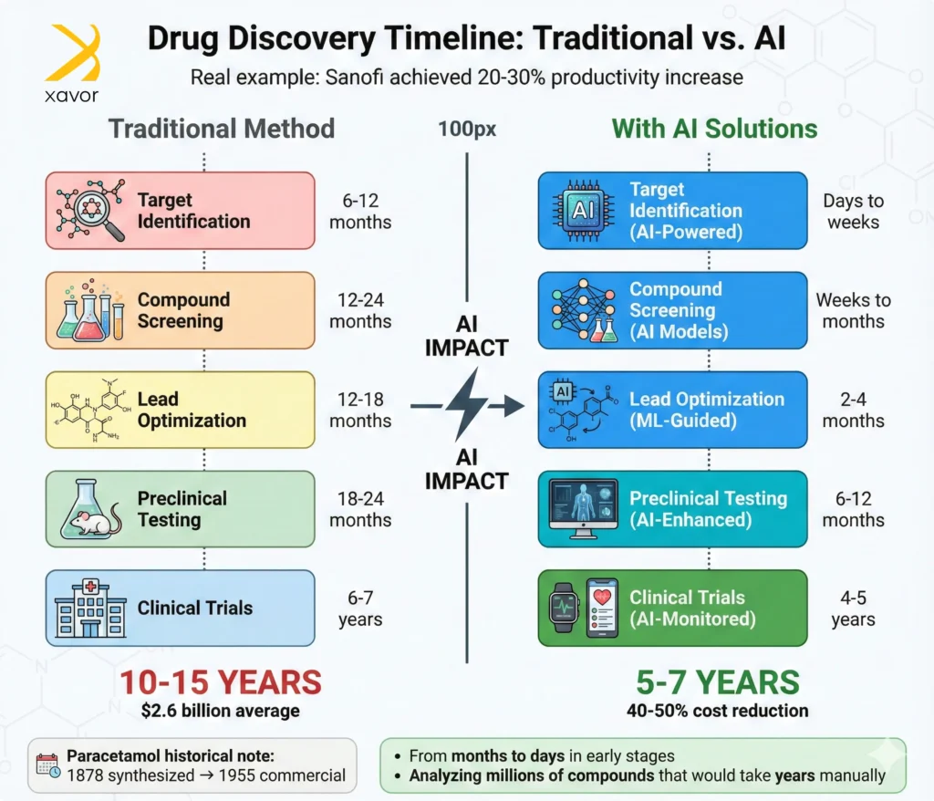 Paracetamol was first synthesized in a laboratory in 1878, but it only became commercially available under the trade name Panadol in 1955. Drug discovery is a long, expensive process. AI in healthcare speeds up this process by analyzing and identifying promising compounds in weeks rather than years.