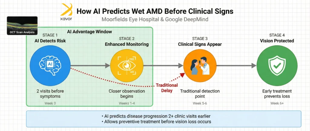 As a result, the AI was able to predict that an eye was likely to worsen at least two clinic visits before clear clinical signs of wet AMD became visible. In practical terms, this means doctors could be warned earlier, monitor patients more closely, and start treatment sooner, which could potentially prevent serious vision loss.