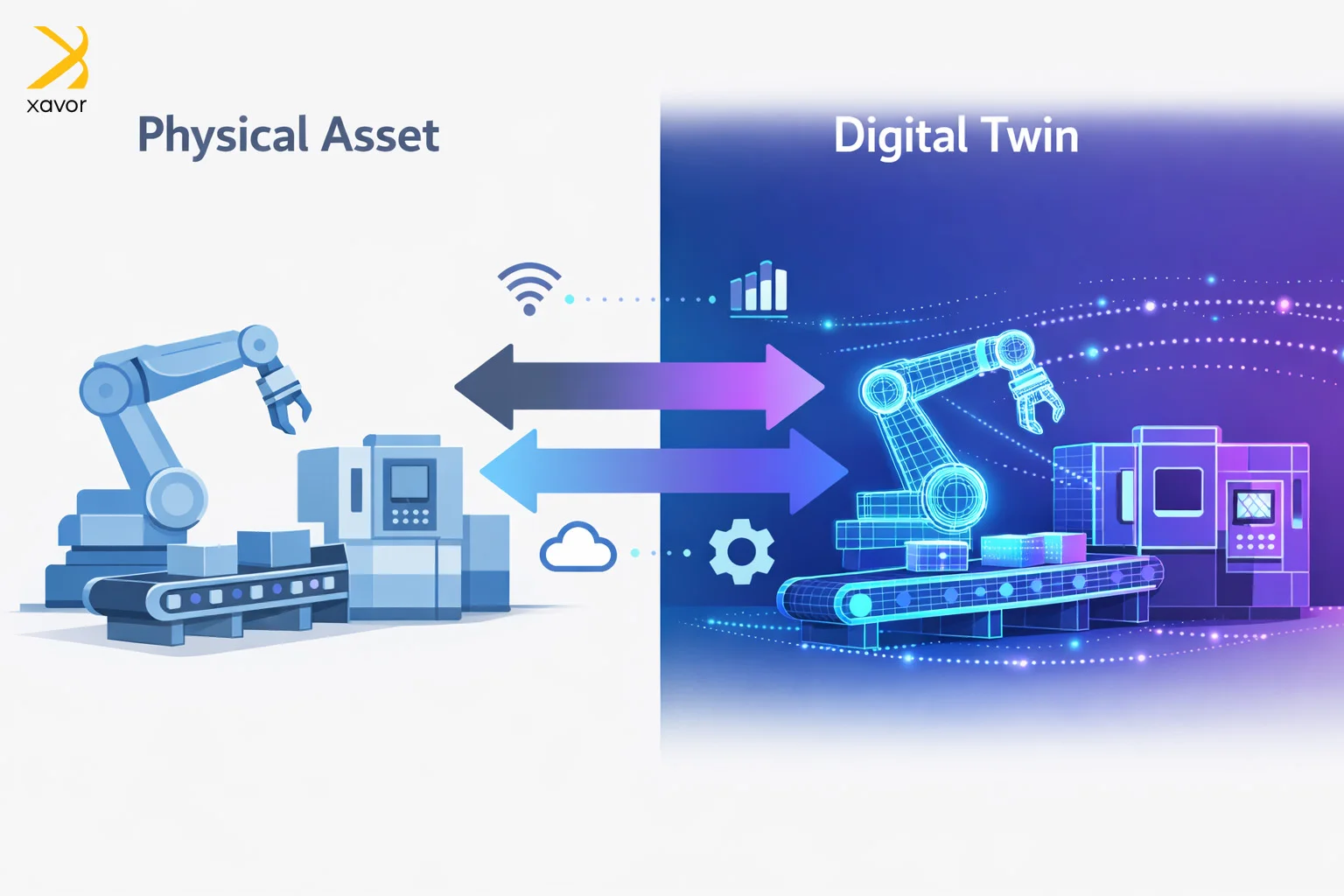 The physical asset and digital twin continuously share information. The real asset updates the twin, and the twin provides insights that improve real operations.