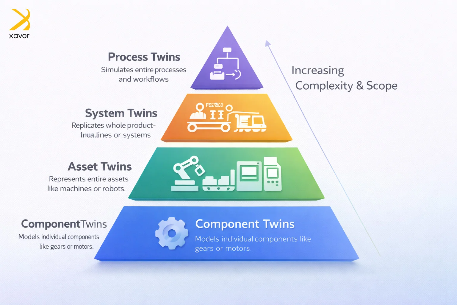 Digital twins come in different types, depending on what you want to model. Each type focuses on a different level in manufacturing, from small parts to full processes.