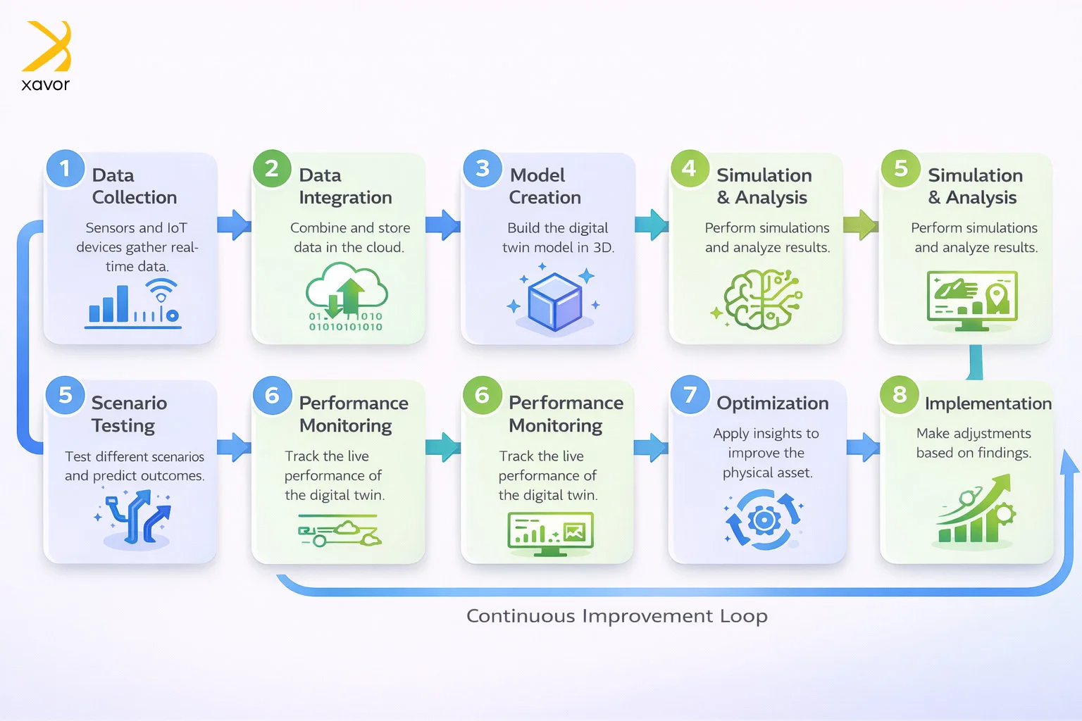 Over time, companies use the digital twin to find inefficiencies, test improvements virtually, and apply the best changes in the real system.