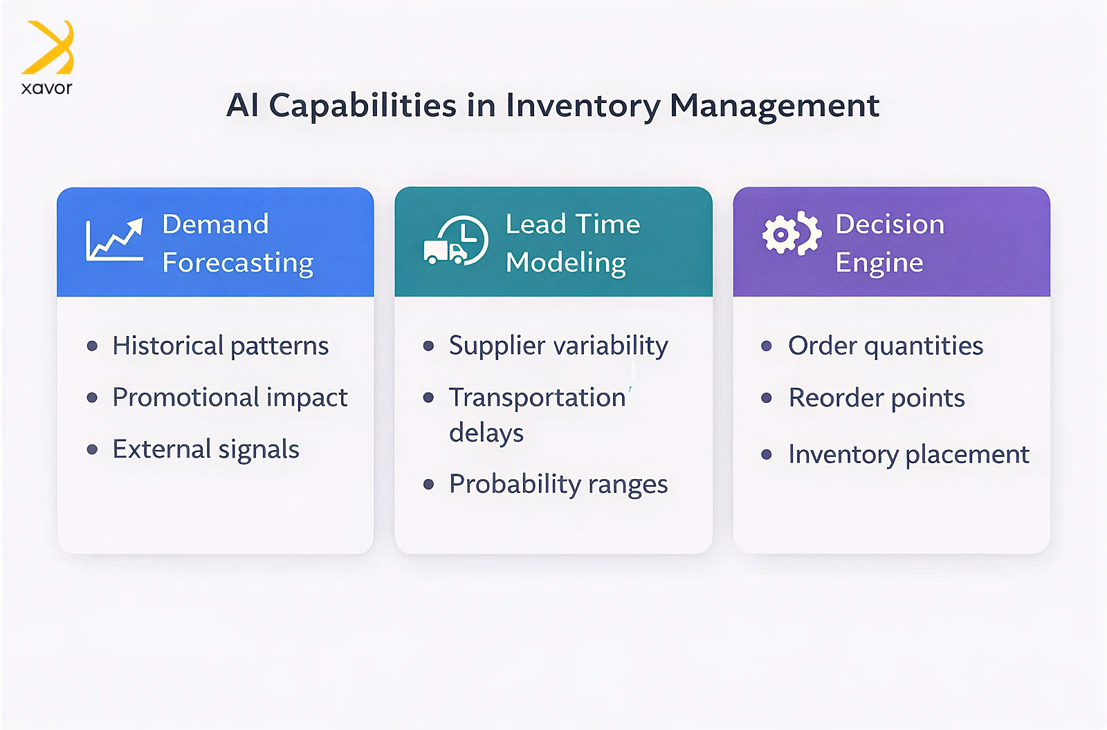 Data engineering standardizes and reconciles data across systems and delivers reliable signals. AI uses those signals to forecast demand, model lead time variability, and recommend order quantities and inventory placement.