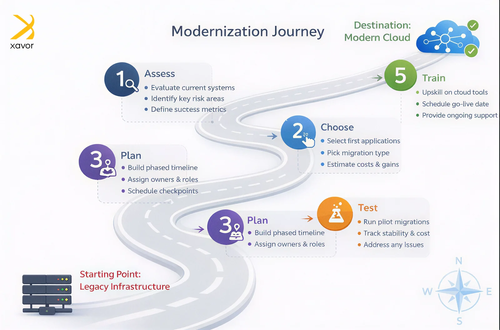 Start by assessing your current systems and identifying the highest risk areas. Then migrate in phases by moving less critical systems first, testing thoroughly, and upgrading core systems gradually. Choose the right method based on need: rehosting for speed, replatforming for improvements, or refactoring for the most long-term value.