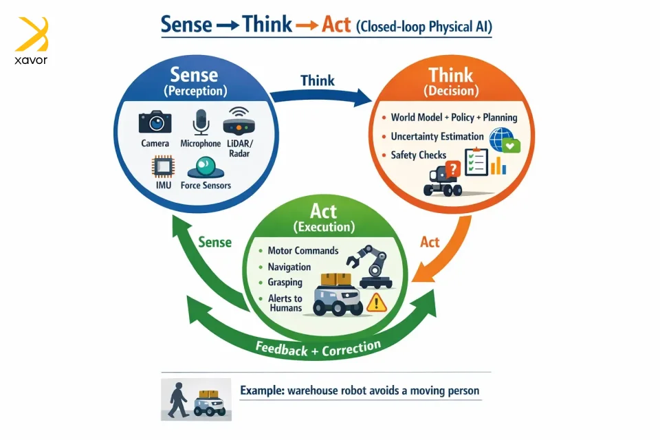 The sense-think-act cycle is the fundamental model behind the working of physical AI systems. It is pretty similar to how humans operate with the world around us.
